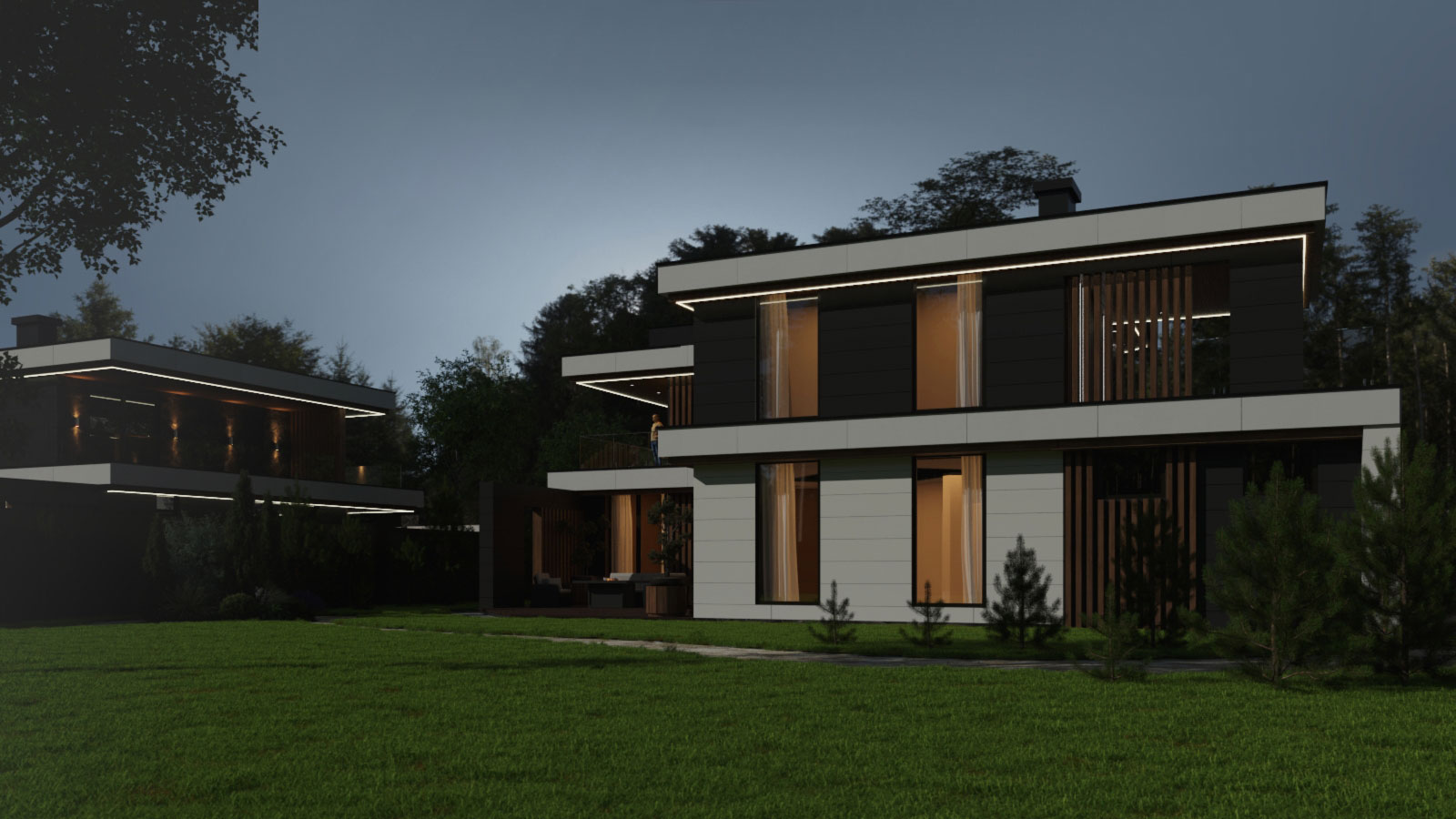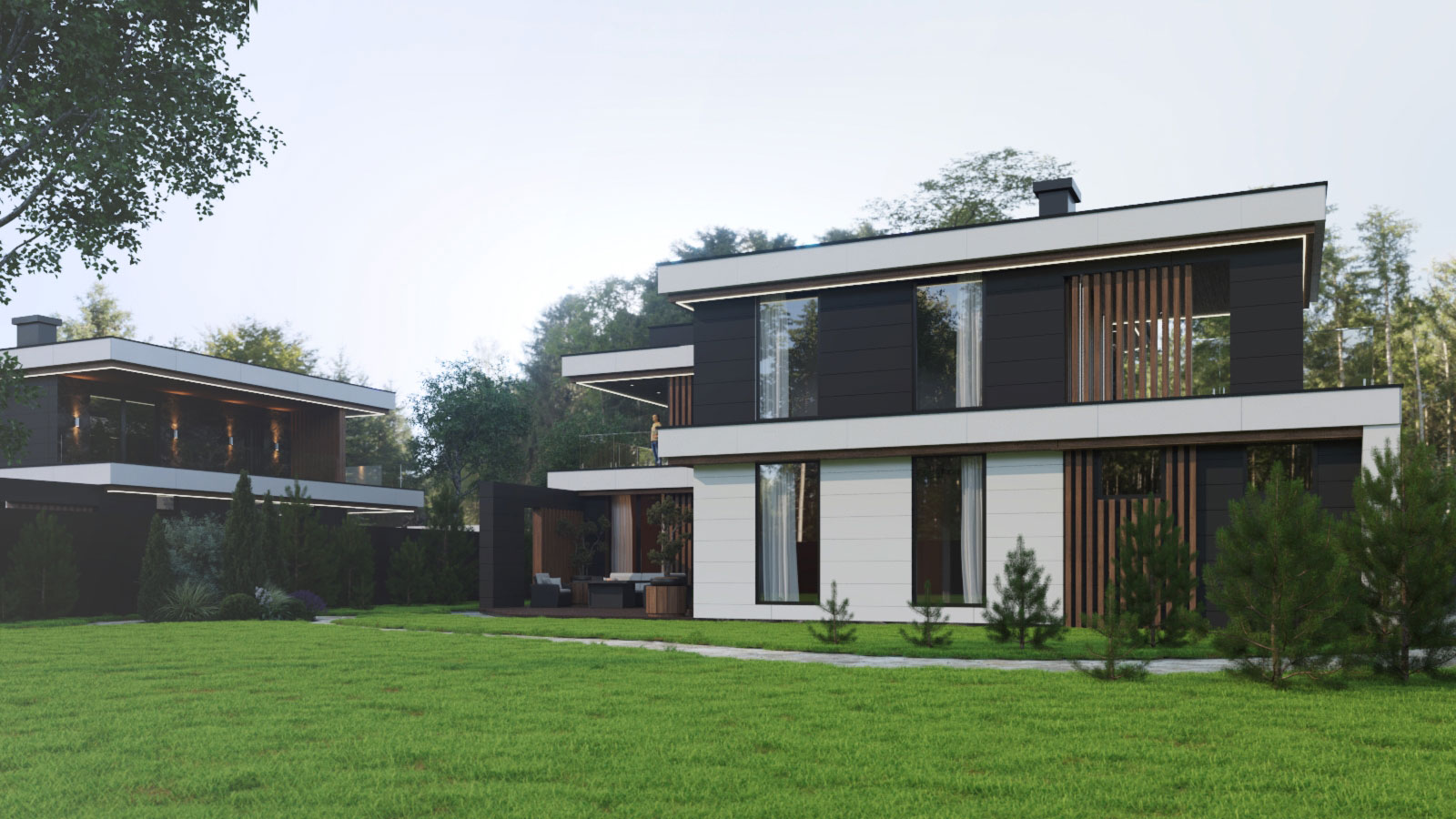 Архитектурный проект загородного дома 250 кв.м. в коттеджном поселке. Для клинта выполнена разработка 3 типов современных двухэтажных домов в единой стилистике, с индивидуальными архитектурными особенностями и планировкой, которую по желанию конечного клиента можно изменить.