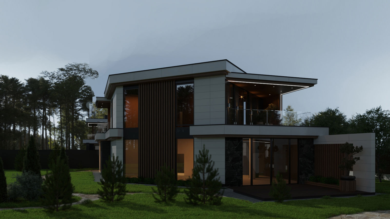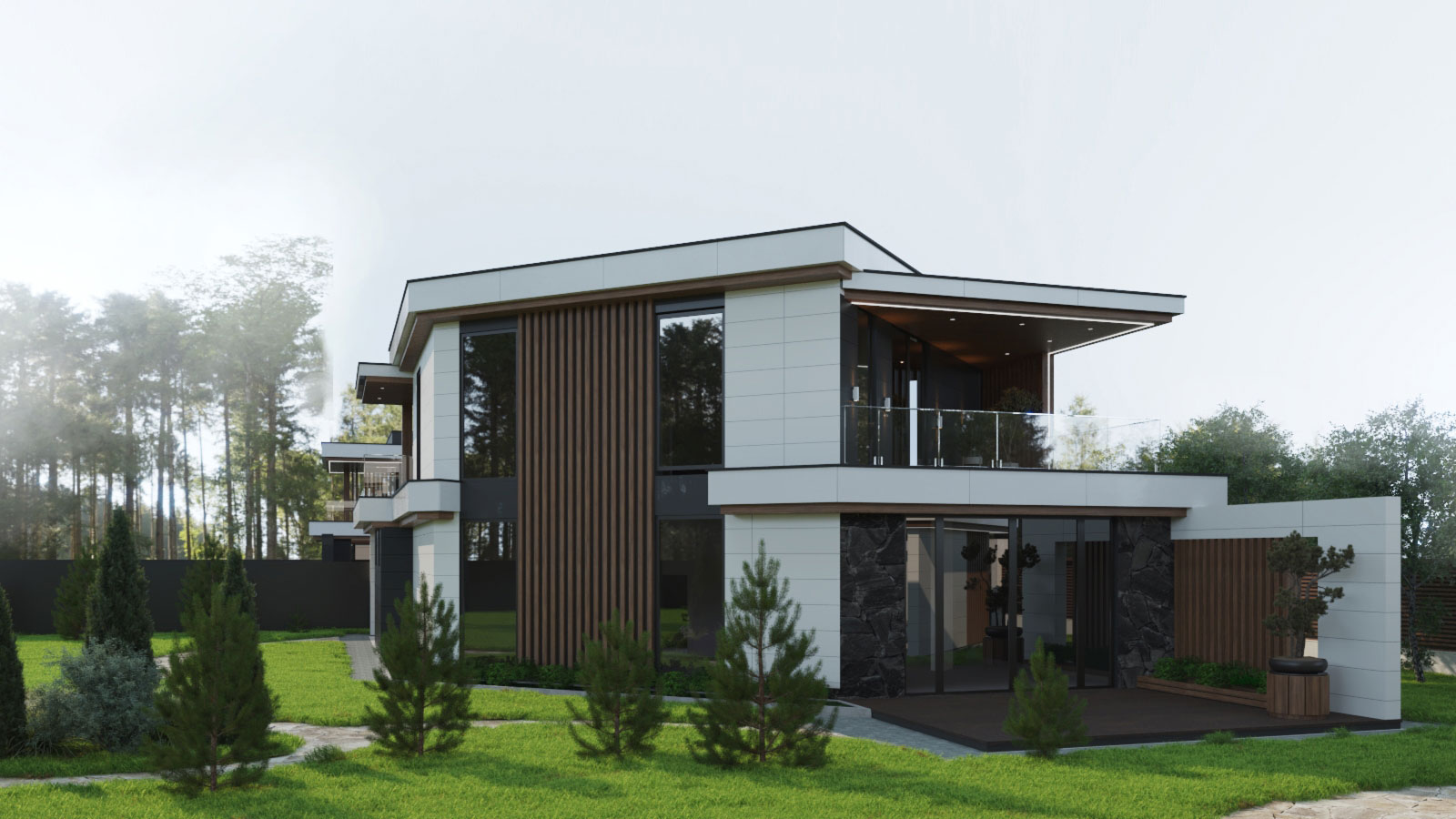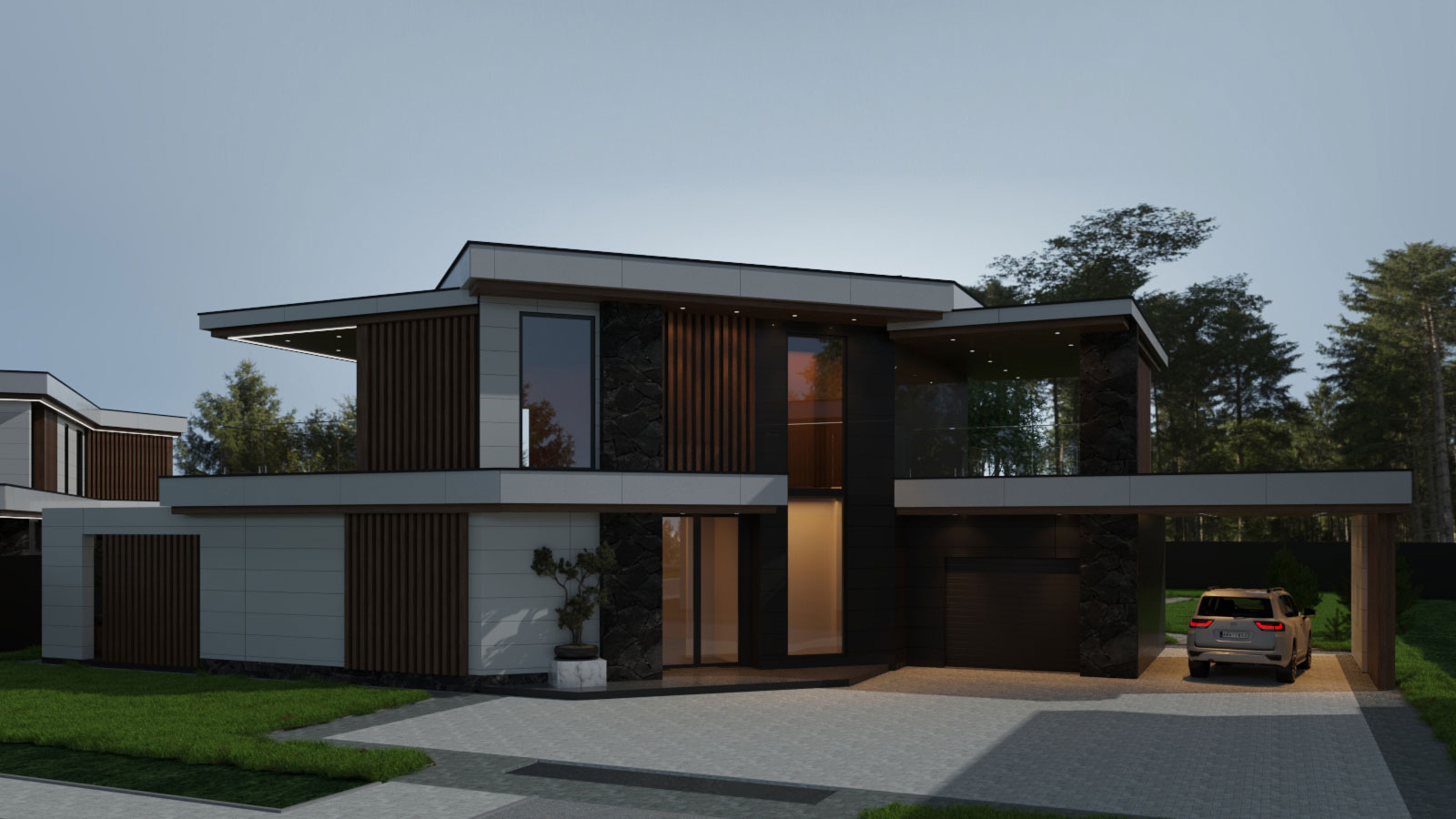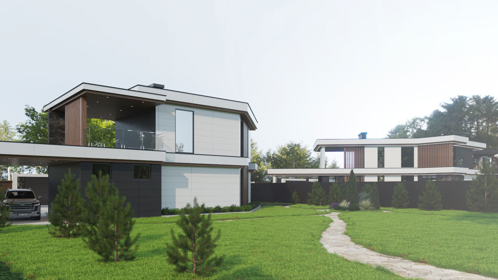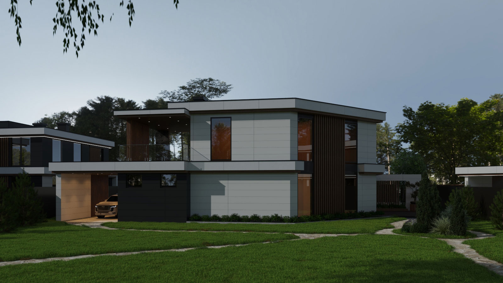 Архитектурный проект загородного дома  245 кв.м. в коттеджном поселке. Для клинта выполнена разработка 3 типов современных двухэтажных домов в единой стилистике, с индивидуальными архитектурными особенностями и  планировкой, которую по желанию конечного клиента можно изменить.