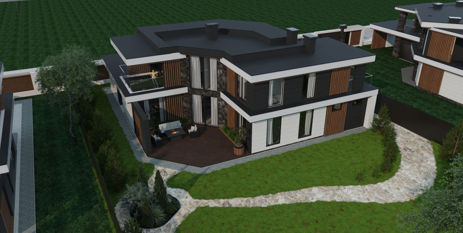 Архитектурный проект загородного дома 250 кв.м. в коттеджном поселке. Для клинта выполнена разработка 3 типов современных двухэтажных домов в единой стилистике, с индивидуальными архитектурными особенностями и планировкой, которую по желанию конечного клиента можно изменить.