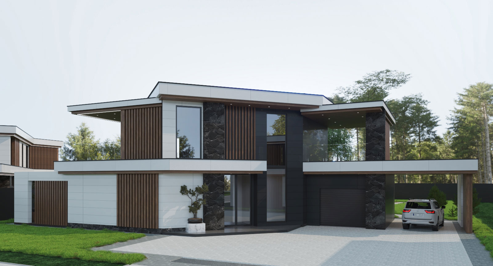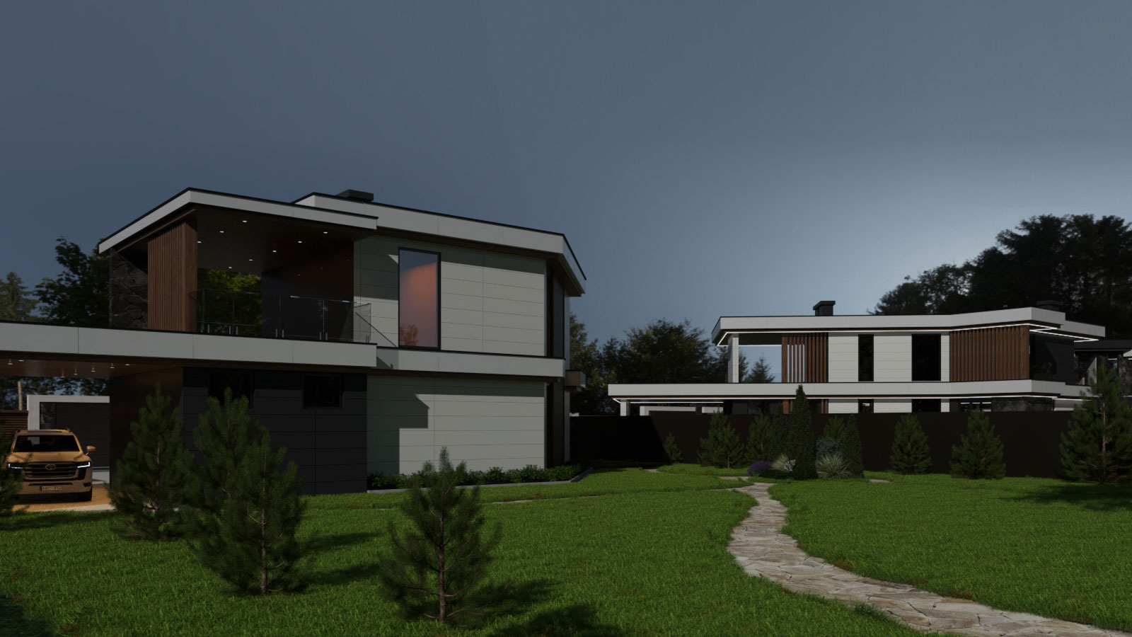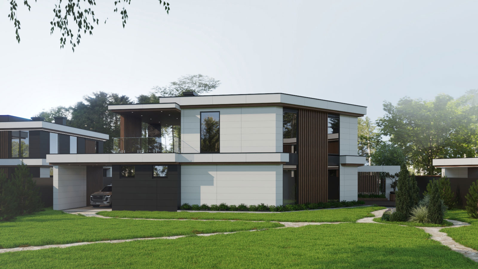 Архитектурный проект загородного дома  245 кв.м. в коттеджном поселке. Для клинта выполнена разработка 3 типов современных двухэтажных домов в единой стилистике, с индивидуальными архитектурными особенностями и  планировкой, которую по желанию конечного клиента можно изменить.